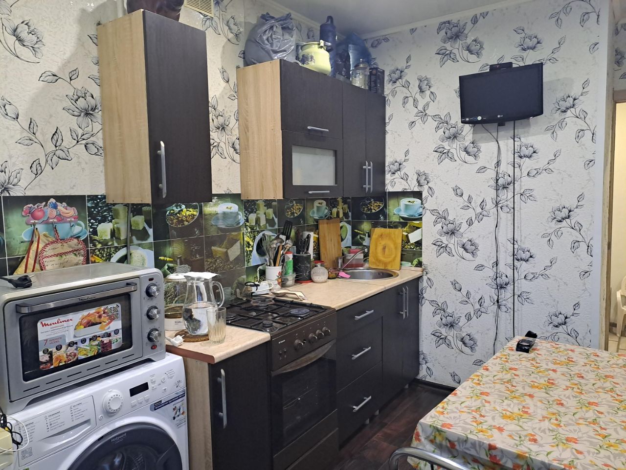 Кухня большая и светлая, 10 м², есть место и для дивана (фактически ещё одно спальное место), и для стиральной машины.Газовая плита, кухонный уголок.